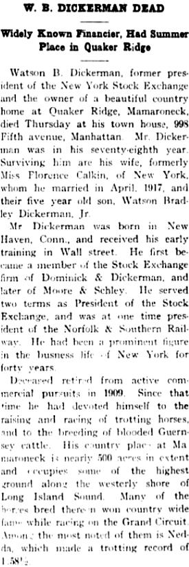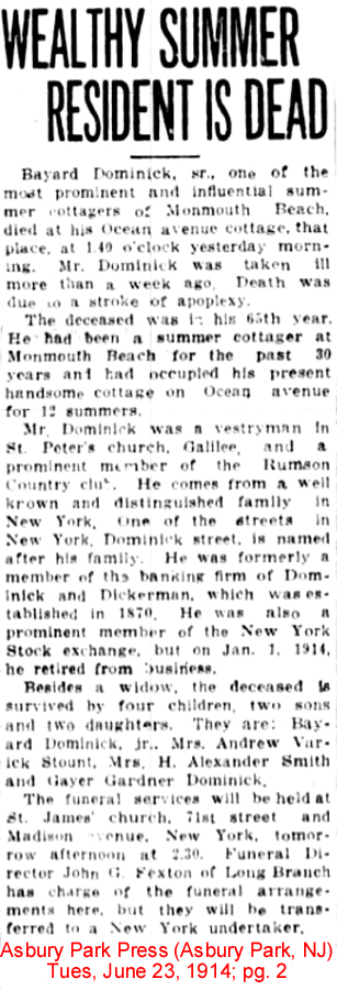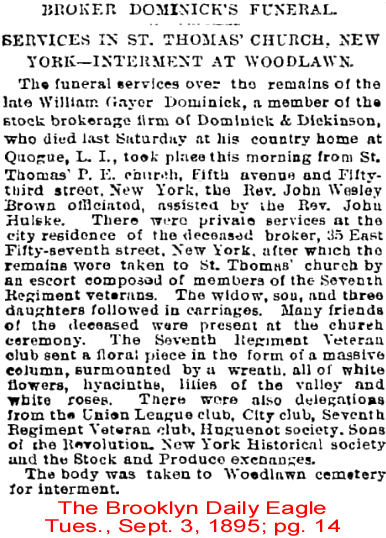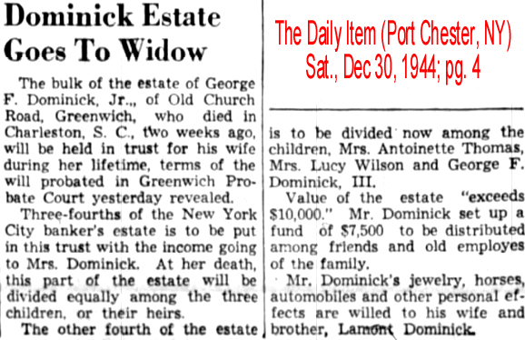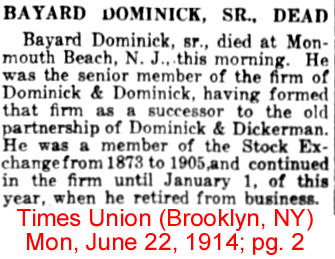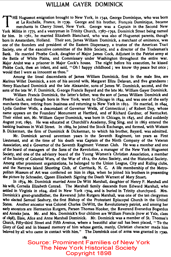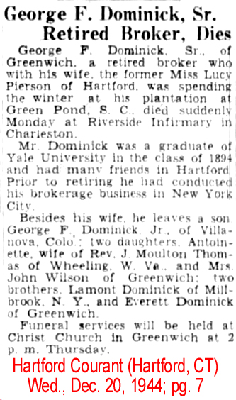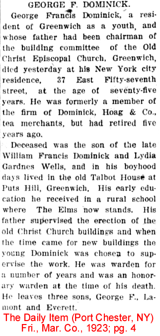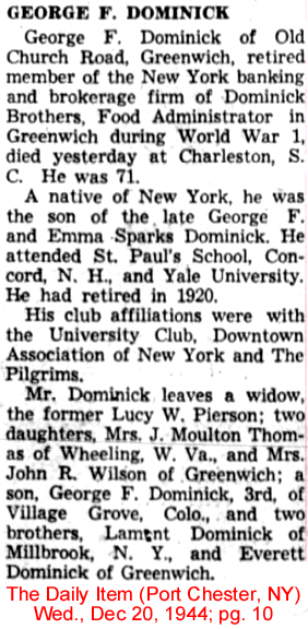 | William Francis Dominick | 20 Dec 1897 | William was born in NY City on Sept. 21, 1875 & died in Greenwich, CT on Jan. 16, 1945 [see obituary] |