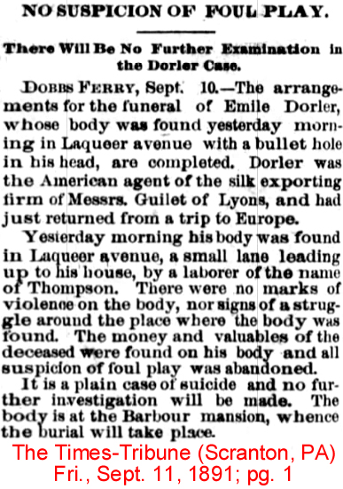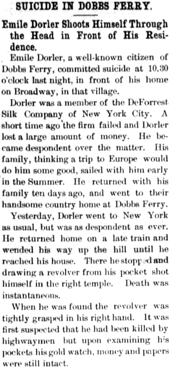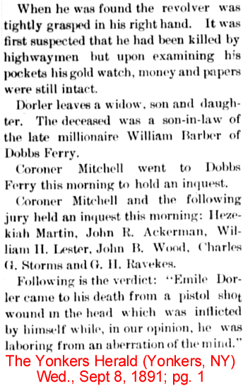 | Emile Dorler | 21 July 1883 | Emile was born in New York on Dec. 21, 1853 & died Oct. 12, 1891 in New York City. He is buried in Greenwood Cemetery in Brooklyn, NY. Emile married Elizabeth Barbour (1857-1926), daughter of William Barbour (1814-1885) & Elizabeth Cowan Johnston (1820-1895) [see obit-part 1 & part 2 & part 3] |