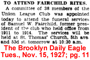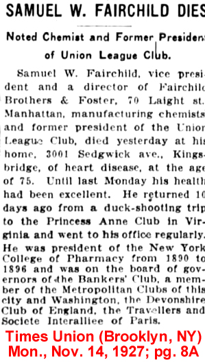 24 Dec 1900 | Samuel William Fairchild was born in Stratford, CT on Aug. 22, 1852 and died Nov. 13, 1927 in the Bronx, NY [see obituary & attendance of Union Club members] . He married Emily Justina Tappen (1853-1936 see 1922 passport photo] on Oct. 17, 1877 in Manhattan. They are buried in Woodlawn Cemetery in New York City, NY. In the 1880 & 1900 Manhattan census Samuel is listed as a chemist. Thomas Fairchild, along with his brother, Samuel W. Fairchild and Macomb George Foster, formed "Fairchild Brothers & Foster" who specialized in making drugs to assist digestive disorders. The company was first acquired by Winthrop Chemical Company and then later by Sterling Drug, Inc. Stearns & Company, a subsidiary of Sterling Drug, Inc., took over the distribution of all except three drugs made by the acquired concern. Winthrop Chemical Company, also a Sterling subsidiary, resumed the manufacture of Marinol, Phisoderm, and Enzymo. |