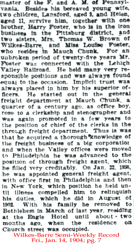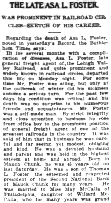 21 July 1883 | Asa Lansford Foster, son of Thomas Lansford Foster (1823-1908), was born Jan. 9, 1859 in Jim Thorpe, PA and died in Bethlehem, PA on Jan. 11, 1904 [see obituary part 1 & part 2] He married May McCalla (1863 - 1935) in 1889 and is buried at Mount Moriah Cemetery in Philadelphia, PA. He was general freight agent at Lehigh Valley Railroad. |