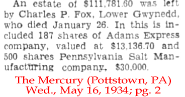 | Charles P. [Pemberton] Fox | 19 Nov 1897 | Charles Pemberton Fox was born Jan. 9, 1858 and died Jan. 26, 1934. He is buried at Church of the Messiah Cemetery, Gwynedd, PA. He married Mary Large in (1878 - 1962). His father, Dr. George Fox, owned vast real estate in Pennsylvania, and his home was Spring House, Lower Gwynedd, PA. [see estate article] |