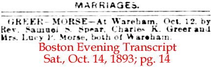 | Charles [Knowlton] Greer | 21 July 1883 | Charles Knowlton Greer, son of Nathaniel Greer & Mary J. Knowlton, was born in Belmont, ME on Apr. 4, 1837 and died in Taunton, MA on June. 8, 1924. Charles and both of his wives are buried at Centre Cemetery, Wareham, Plymouth Co., Ma. He married 1st Harriett "Hattie" Amelia Morse (1846 - 1891) in Wareham, MA on July 1, 1865; 2nd to Hattie's sister-in-law, Lucy Priscilla (Gibbs) Morse (1849-1931) on Oct. 12, 1893 [see marriage announcement]. In the 1870 Wareham , MA census he is listed as a carpenter and the same in the 1880 Wareham, MA census. |
