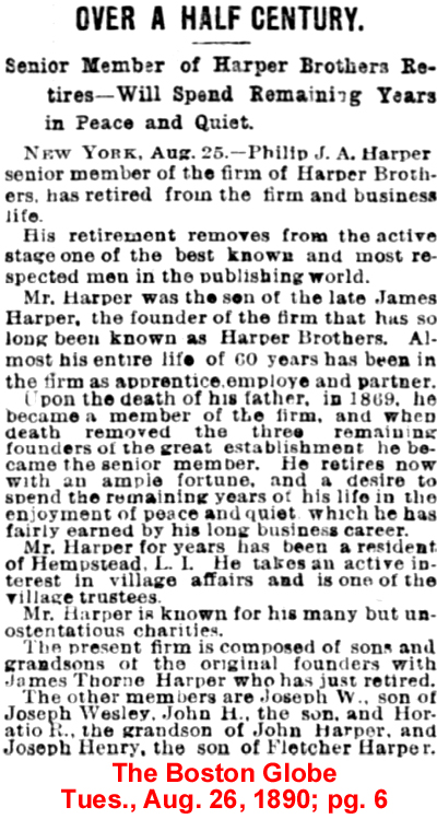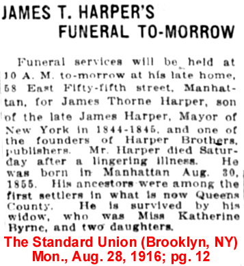 | James T. [Thorne] Harper | 21 July 1883 | James Thorne Harper (Aug. 30, 1855 - Aug. 26, 1916 see obituary) was a publisher. His father, James Harper (1795 - 1869), had founded the publishing firm of Harper & Brothers along with his brothers. The firm later became Harper & Row, and today it is Harper Collins. His father, James Harper, was elected mayor of New York City in 1844. His mother was Julia Thorne (1821 - 1902). On Jan. 30, 1883 he married Katherine Clark Byrne at the Madison Square Presbyterian Church. They had two daughters, Ethel and Florence, and lived at 58 Madison Avenue, NYC. |