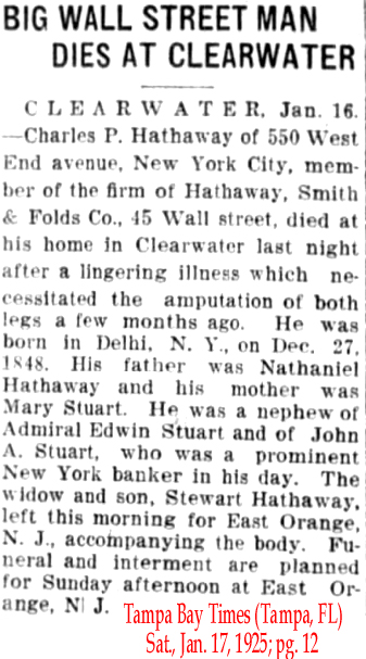 17 Dec 1885 | Charles P. Hathaway, son of Nathaniel Hathaway and Mary Stuart, was born in Delhi, NY on Dec. 27, 1848 and died in Clearwater, FL on Jan. 16. 1925 [see obituary]. He married Cora Southworth Rountree in Plattfield, WI, on Oct. 5, 1882. They are buried in Rosedale Cemetery in Montclair, Essex Co., NJ. |