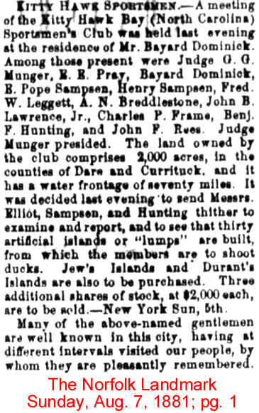 The Kitty Hawk Bay Sportsman's Club was organized July 18, 1881, but in September of that year the name was changed to Kitty Hawk Club. It was publicly announced that the association controlled 240,000 acres of land in North Carolina, with 170 miles of waterfront, to be used for hunting and fishing purposes. There were twenty-four charter members, as follows: John H. Reed, Bayard Dominick, Thomas J. Barbour, Norman Peck, W. G. Dominick, C. R. Purdy, R. V. R. Schuyler, J. T. Harper, W. H. De Forest, Jr., E. Everett Pray, B. F. Huntting, Henry Sampson, Geo. Bird Grinnell, D. G. Elliot, A. N. Beadleston, J. A. Hewlett, Chas. T. Barney, Chas. P. Frame, Frederick W. Leggett, John B. Lawrence, Jr., R. H. Robertson, G. G. Munger, Emile Dorler, and E. Pope Sampson.