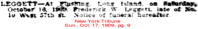 | Fred W. [Frederick William] Leggett | 21 July 1883 | Frederick was born in New York City on Apr. 20, 1842 & died in Queens, NY on Oct. 16, 1909. He was married in NY on Nov. 5, 1867 to Mary Elizabeth Freeman who was born in New York, June 28, 1844; died in New York, Dec. 14, 1907. The wills of Frederick William Leggett and of his wife, Mary E. (Freeman) Leggett are on file in the Surrogate's Office, New York City. That of Frederick William is dated May 13, 1880, with a codicil April 2, 1898, proved Oct. 23, 1909; he leaves bequests to his wife, Mary Elizabeth, and children Louise and Warren F. Executors, his wife (who however had predeceased him), brother-in-law Isaac Sherwood Coffin and friend John D. Mairs (who died in 1898). Witnesses were his brother, Edgar A. Leggett, George Lilly and Charles E. Swain (died about 1884). The will of Mary Elizabeth Leggett, wife of Frederick W., dated April 1, 1891, codicil May 19, 1904, proved May 22, 1908, mentions her children, Louise and Warren Freeman Leggett, directs a division, etc., of a certain bequest to them from their grandmother, Julia A. Freeman. Witnessed by her brother-in- law, Edgar A. Leggett of 22 Seventh Avenue, Brooklyn, and George Lilly. They are buried at Sleepy Hollow Cemetery in Westchester Co., NY. [see death notice] |