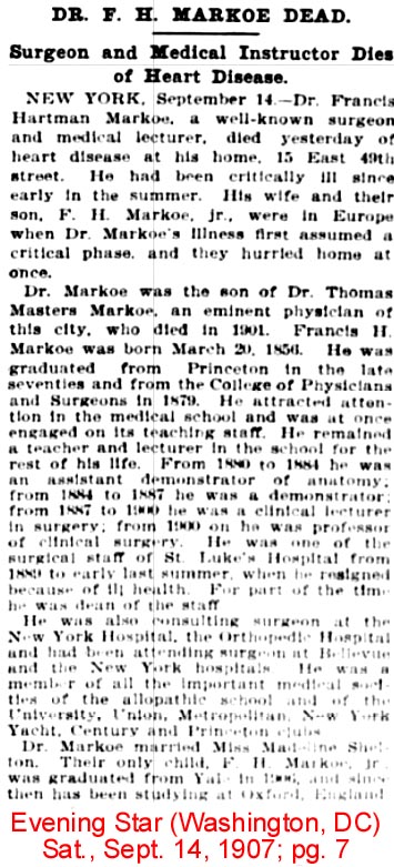 | Francis H. [Hartman] Markoe | 2 Apr 1901 | Dr. Francis H. Markoe (Mar. 20, 1856 - Sep. 13, 1907) was married to Madeline Shelton, who died in 1928. He is buried at Sleepy Hollow Cemetery in Westchester Co., NY. [see obituary] He had a brother, Dr. James Wright Markoe (July 19, 1862 - Apr.18, 1920) who was married to Annette Wetmore Butler who lived till 1962. Dr. James W. Markoe was walking down the aisle with the collection plate in his hand at St. George's Episcopal Church, when Thomas W. Simpkin shot him in the forehead with a handgun. Dr. Markoe died shortly after in a hospital. J. P. Morgan, Jr., narrowly escaped assassination. Dr. James W. Markoe had been the personal physician of the elder J. Pierpont Morgan, and he was one of his closest friends. J. P. Morgan, Jr., was a member of the Currituck Shooting Club. |