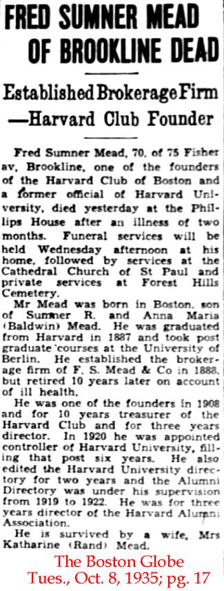 5 Jul 1900 | Frederick Sumner Mead was born July 25, 1866 in Boston, MA and died in Boston on Oct. 7, 1935 [see obituary]. He is buried at Forest Hills Cemetery & Crematory, Jamaica Plain, MA. His parents were Sumner R. & Ada Lawrence Mead {obituary has different mother]. He married Katherine Rand in Medford, MA on June 11, 1890. |