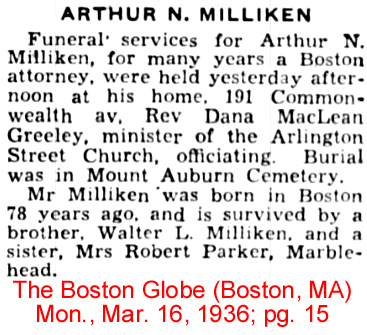 | Arthur N. [Norris] Milliken | 1 Mar 1910 | Arthur was born in Boston, MA on Feb. 8, 1858 to Ebenezer C. & Charlotte J. Milliken. He married Mabel Minot Marsh in Boston on June 9, 1888. He died Mar. 12, 1936 in Boston. [see obituary] They are buried in the Mount Auburn Cemetery in Cambridge, MA. |