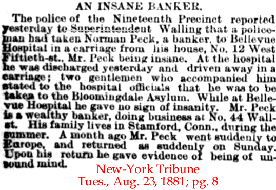 | Norman Peck | 21 July 1883 | Norman Peck was born Mar. 3, 1839 in New Britain, CT and died in Manhattan, NY on Sept. 23, 1887. His parents were Capt. Norman Peck (1791-1861) and Mary Elizabeth Hibbard (1802-1862). In May 1867 he went into a co-partnership with Jonathan & William A. Odell to buy & sell mercantile paper but in 1870 this partnership was dissolved by mutual consent and Peck started another partnership with Nathaniel Berry & Louis F. Martin to still sell commercial paper. He married Laura Amanda Waters in Kings. Co., NY on Nov. 29, 1871. The 1880 NY census indicates that he was a banker and had 3 sons & 5 servants in his home. Their address was 182 W. 50th St. in NY City. A newspaper article indicates he was taken from his home to a hospital for the insane in 1881 but was apparently of sound mind in 1883 when he joined this club. Online records indicate he was buried in Greenwood Cemetery in Brooklyn, NY. |