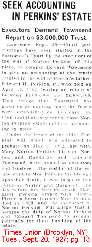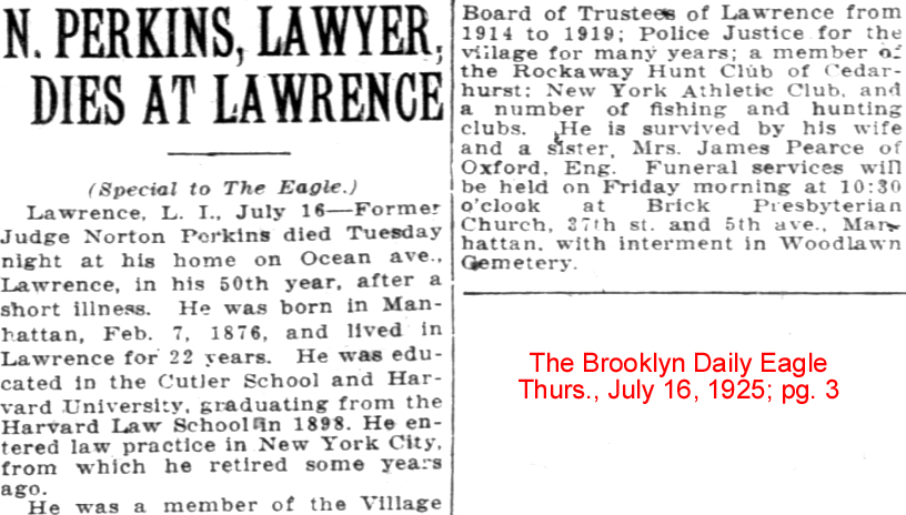 | F. Norton Perkins | 4 Dec 1919 | Norton was the son of Edward Henry Perkins, Jr. & Mary Norton Perkins. He was born on Feb. 7, 1876 in Manhattan, NY & died in Cedarhurst, NY on July 14, 1925. He is buried in Woodlawn Cemetery in the Bronx, NY. He was listed as a lawyer on his 1918 WWI Registration Card. [see obituary] [see article on estate of Edward H. Perkins, Jr.] |