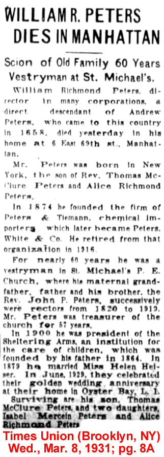 | William R. [Richmond] Peters | 13 Mar 1901 | William Richmond Peters was born in NY on Apr. 13, 1850 & died in Manhattan on Mar. 17, 1931 [see obituary]. He married Helen Russell Heiser (1852 - 1929) in NY. on June 11, 1879. They are buried in St. Michael's Cemetery in East Elmhurst, NY. |