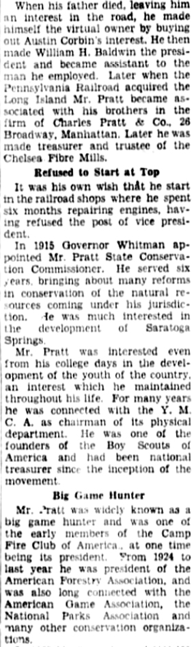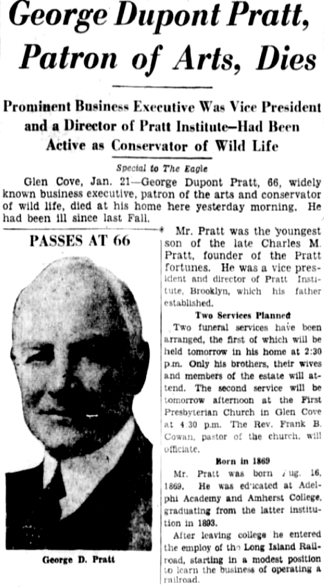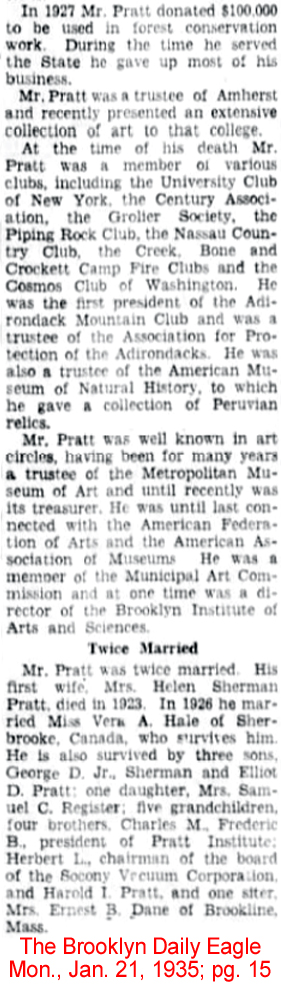 16 May 1923 | There is a slight tie between George Dupont Pratt, member at Narrows Island, with Lawrence Bell Van Ingen, member at the Currituck Shooting Club. Lawrence B. Van Ingen (Oct. 18, 1898 - Oct. 31, 1943) married/divorced (1938) Harriet Balsdon Pratt (1901 - 1978). Her father, Herbert L. Pratt (1871 - 1947) was a brother of George D. Pratt (Aug.16, 1869 - Jan. 20, 1935). They were the sons of Charles Pratt (1830 - 1891), who merged his oil company, Charles Pratt and Co., with John D. Rockefeller's Standard Oil in 1874. Charles Pratt also founded the Pratt Institute in Brooklyn. George Dupont Pratt was head of Standard Oil of New York (later became Mobiloil), graduated Amherst College in 1893, set the record for the two mile bicycle race, was assistant to the president and superintendent of ferries for the Long Island Railroad, treasurer of Boy Scouts of America in 1910, president of the American Forestry Association, and a major donor to the Metropolitan Museum's Decorative Arts Department. His home was Killenworth at Glen Cove, Long Island. He married (1) Helen Deming Sherman (1869 - 1923), and (2) Vera Hale. [see obituary part 1; part 2; part 3 |