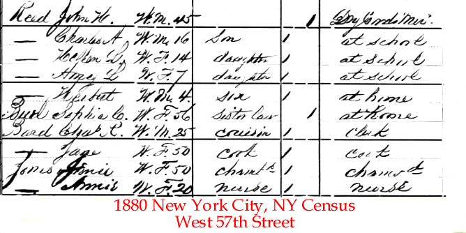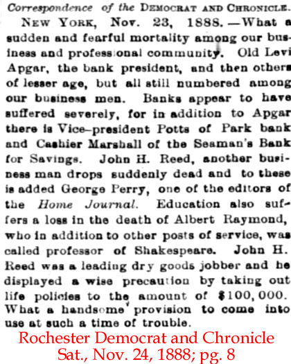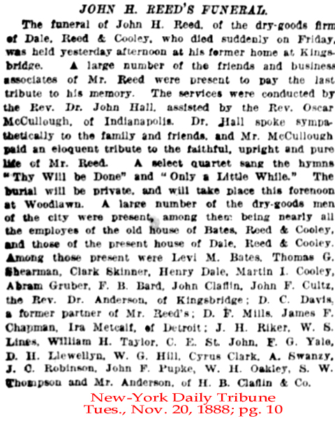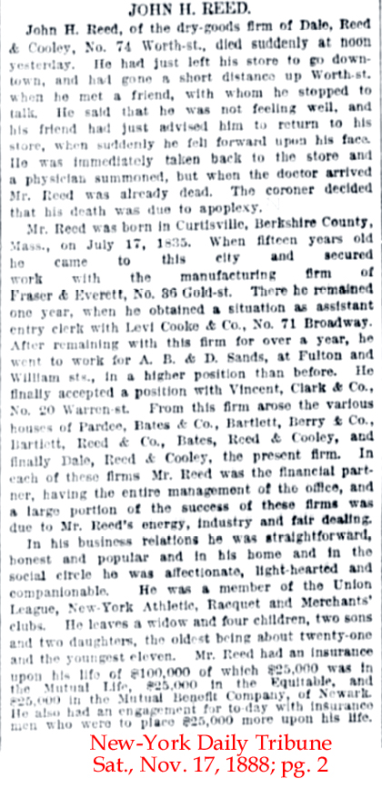 | John H. [Herbert] Reed | 21 July 1883 | John Herbert Reed was born in Interlaken, MA on July 17, 1835 and died in New York City on Nov. 16, 1888 [see obituary & funeral attendance & life insurance]. His parents were both born in CT. In the 1870 census & 1880 census he was listed as a dry goods merchant. He wrote his will on Sept. 4, 1885 and it was probated on Dec. 19, 1888. John was first married to Anna S. Bard c. 1862. He married Teccca Niswanger on Mar. 5, 1885. Tecca is mentioned in his will. His will states that he will be buried in Woodlawn Cemetery in New York. |