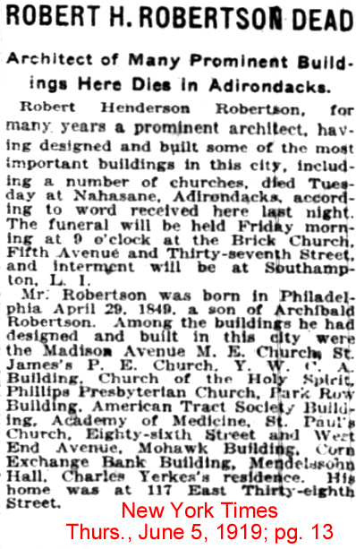 | R.H. [Robert Henderson] Robertson | 21 July 1883 | Robert Henderson Robertson was born Apr. 29, 1849 & died June 3, 1919 [see Find-A-Grave; see obituary]. He married Charlotte Markoe (Dec.8, 1854 - June 13, 1909). Her brother, Dr. Francis Hartman Markoe, was a member of Narrows Island Club. Another of her brothers was the Dr. James Wright Markoe (July 19, 1862 - Apr.18, 1920), who was shot and killed inside St. George's Episcopal Church, and who was J. P. Morgan, Sr.'s, personal physician. Robertson was a renown architect, and a partial listing of some of his works is given. [see Wikipedia] He is who designed the Narrows Island Club, according to the club history. No known existing photo has ever appeared other than one showing only the top of the roof anchored among some willow-like trees, showing a possible Second Empire or Romanesque Revival roofline. A good guess is that his architectural files still exist somewhere, and the plans for Narrows Island are in them. He designed a house for Hugh D. Auchincloss in NYC plus his summer place at Newport, R.I., Hammersmith Farm. Hugh Dudley Auchincloss (1858 - 1913) was married to Emma Brewster Jennings (1861 - 1942), whose brother, Oliver Gould Jennings (1865 - 1936) was a member of the Currituck Shooting Club. He was married to Mary Dows (1871 - 1964). Hugh Dudley Auchincloss's son, also Hugh Dudley Auchincloss ( 1897 - 1976), was step-father of Gore Vidal and Jacqueline Bouvier Kennedy Onassis. Oliver G. Jennings & Emma B. Jennings Auchincloss were children of Oliver Burr Jennings, who held 1,000 of the original 10,000 Standard Oil shares issued Jan. 10, 1870 in Ohio. To give some perspective of how much money that was - John D. Rockefeller had 2,667 shares; Henry Morrison Flagler, who developed Florida, had 1,333 shares. |