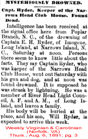 In 1892, Van Slyke's wharf was leased to J. W. Bennett, of Norfolk; and in this year also G. B. Bliven, who had bought Duck Island in Dare County, when it was sold for taxes, offered to deed the land to the club for $25.00 and costs, which offer was accepted.