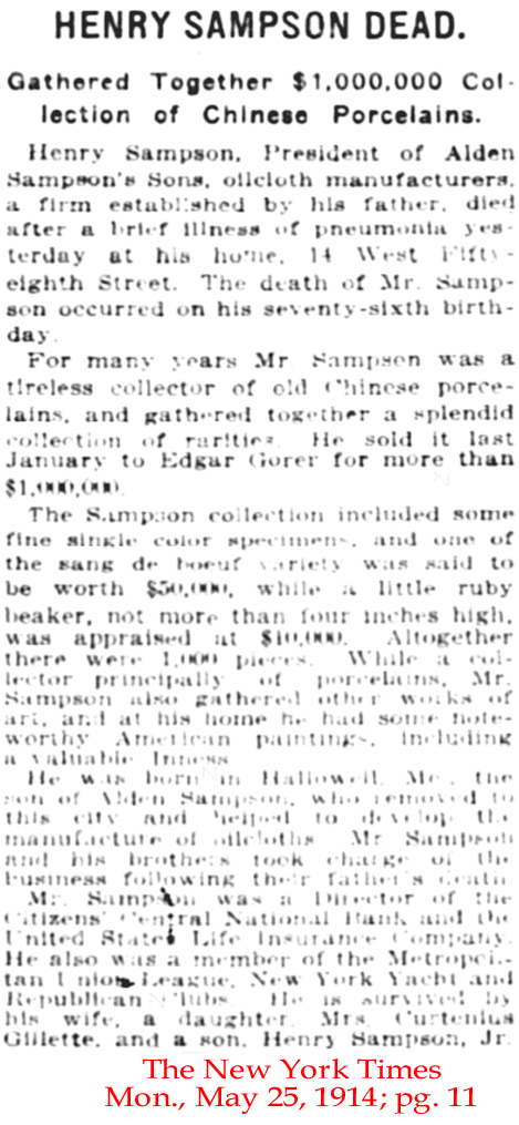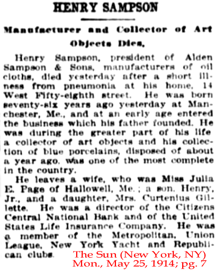 below] "Tariff Hearings Before the Committee on Ways and Means - 1893" . . . The disruption by death of the time-honored house of Alden Sampson & Sons will cause a profound regret throughout the trade. This occurred Thursday May 18 in the death of Mr. E. P. Sampson at his residence No. 2 West Fifty-first street. Deceased was born in old Hallowell, Me., where or near where the elder Sampson started one of the very first oilcloth factories in the United States. The present firm conduct now a factory at Hallowell, their principal works, however, being at Astoria, Long Island." |