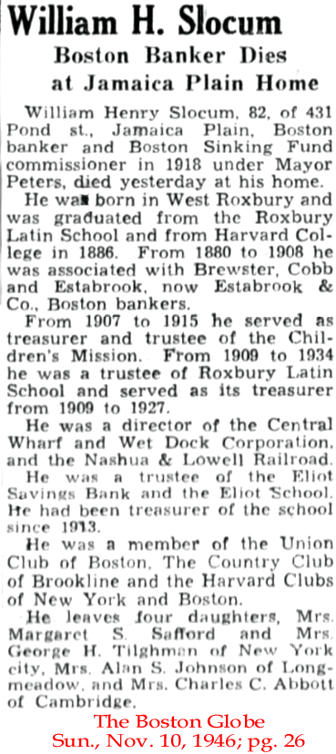 | William H. [Henry] Slocum | 19 May 1911 | William Henry Slocum was born in Boston, MA on Dec. 21, 1863 to William H. Slocum and his wife, Sarah Elizabeth (Williams) Slocum. He married Louise Austen The 1900 Suffolk Co. MA census shows him as a stock broker with 4 servants in the home; the 1910 census for the same county shows him with 3 servants and is a "trustee for private estates". In 1920 he is in Boston in the Jamaica Plain area and has 3 servants. The 1930 Boston census shows that he lived at 431 Pond St. in Jamaica Plain with 3 servants. William died in Jamaica Plain on Dec. 9, 1946 [see obituary] and is buried at Forest Hills Cemetery in that town. |