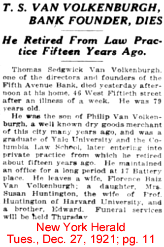 | T.S. [Thomas Sedgwick] VanVolkenburgh | 4 May 1894 | Thomas was born in Stockport, Columbia Co., NY on Aug. 17, 1843 & died Dec. 26, 1921 in Manhattan, NY. He is buried in Kensico Cemetery in Valhalla, Westchester Co., NY [see obituary1 & obituary 2] |