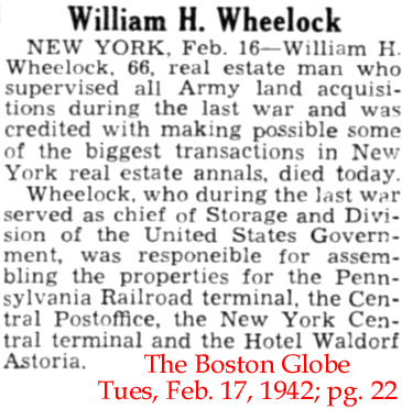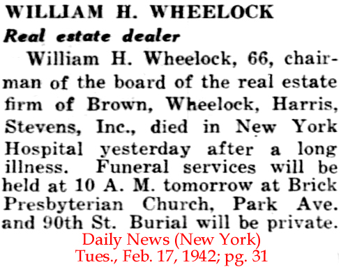 | William H. [Hawkhurst] Wheelock | 22 Jan 1903 | William Hawhurst Wheelock was born Jan. 5, 1876 and died Feb. 16, 1942 [see obitiary1 and obit 2]. He married Catherine Morgan Dix (1879 - 1960). He is buried in the Saint Matthew's Episcopal Churchyard in Bedford, Westchester Co., NY. William joined the Robinson Brown firm after he graduated from Harvard in 1898. Starting in the maintenance department, Wheelock rose through the ranks to become a vice president and director in 1902. When Robinson died in 1918, Wheelock was elected president of the firm. In 1922, Wheelock and Harris arranged a merger of their two firms and the new company was named Brown, Wheelock, Harris, Vought & Co. When Vought left the firm in 1931, the name changed to Brown, Wheelock, Harris & Co. Charles S. Brown died at 85 in 1935. He held the title of chairman of the board. He was a trustee or director of several insurance and banking companies and non-profit groups. He lived at 535 Park Avenue. In 1938, Wheelock took Brown's title of chairman and Harris become president. The firm's main office was at 67 Wall Street. When the new titles were announced, it was noted that Wheelock had participated in the sale of the Waldorf-Astoria Hotel and the assemblage of the land for the Pennsylvania Railroad Station. When Wheelock died in 1942, he was also credited with assembling property for New York Hospital, Presbyterian Hospital and the Brooks Brothers and Gimbels stores. At the time of Wheelock's death, the firm had the name Brown, Wheelock, Harris, Stevens, Inc. |