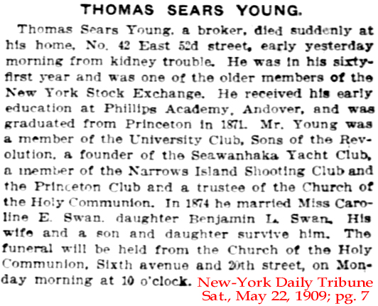| T.S. [Thomas Sears] Young, Jr. | 30 Apr 1885 | Thomas Sears Young was born Jan.6, 1848 and died May 21, 1909 [see obituary]. He married Caroline E, Swan (1851-1936). In 1870 he was a student at Princeton and by 1880 Thomas and his wife, Caroline, were living in the home of her father, Benj. L. Swan, a broker, at West 20th St., NYC. Thomas & Caroline lived in Oyster Bay, Nassau Co., NY in 1900. Thomas is listed as a stock broker and they have 5 servants in the home. Thomas & Caroline are buried in Green-Wood Cemetery in Brooklyn, NY. |