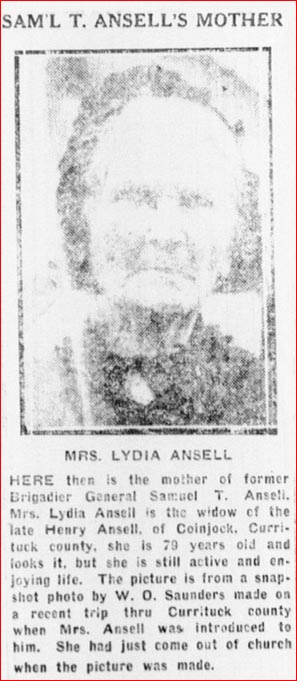 HENRY B. ANSELL DEAD - Currituck County lost one of its oldest and best known citizens last week in the death of Henry B. ANSELL, age 88 years, at his home at Barco. His death followed an attack of influenza. Mr. ANSELL was a native of Currituck County, born on Knotts Island, and had lived in Currituck all his life. In his earlier days he was a prominent, influential and active figure in the county's affairs and served as Clerk of Superior Court on his county for several years. He is survived by his wife and several children including the distinguished Lt. Colonel Samuel T. ANSELL of Washington, D.C.