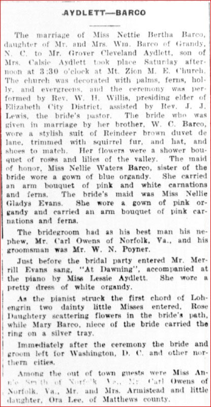 SNOW-BRIGHT - On Tuesday evening, October 12th, a very interesting wedding was solemnized at the home of Mr. and Mrs. Alveston SAWYER of Harbinger when Miss BRIGHT [no first name mentioned] became the bride of Mr. Jordan SNOW. The bride is an attractive young lady of Harbinger and the groom is a prosperous farmer of that place also. Rev. J.L. WALDREP was the officiating minister.GRIGGS-LEWARK - A wedding in which much interest is centered occurred Tuesday morning, Oct. 1th? at the home of Capt. and Mrs. Humphrey LEWARK of Corolla, N.C., when their accomplished and attractive daughter, Odessa LEWARK, became the bride of Mr. William Irvin GRIGGS. Immediately after the ceremony Mr. and Mrs. GRIGGS left for an extended trip to Washington, DC, New York and other northern cities, after which they will make their home in Victoria, Va.