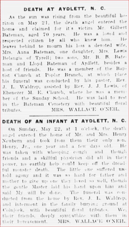 WAS OLDEST RESIDENT OF CURRITUCK COUNTY - Samuel B. HUGHES who died recently at his home near Currituck C.H., was the oldest resident of that county, having passed his 93rd birthday at the time of his death. Until the fall of 1918 he was still active and in good health and could plant his feet in a horse cart and drive about the country as briskly as a youngster. In the fall of 1918 he climbed to a load of cotton piled high on a cart, some of the bags of cotton worked loose and fell off and he went to the ground with them. The fall of several feet so crippled him that he kept to his bed until the time of his death. The immediate cause of his death was complications following an attack of influenza.BELL-ETHERIDGE - A wedding of much interest to the people of Pasquotank County took place at the home of Mrs. Mary E. ETHERIDGE, widow of the late W.K. ETHERIDGE, Wednesday, June 16, when her daughter, Agnes Louisa, became the bride of Mr. Wilson Haywood BELL of Oceana, Va. Dr. Geo. W. CLARK, pastor of Blackwell Memorial Church performed the ceremony. Only the family of Miss ETHERIDGE and a few friends were present. The bride is one of the best known young ladies in rural Pasquotank. For three years she has made an excellent record as a teacher in Newland High School. The groom is from a well know Currituck County family and is now a promising business man connected with the Norfolk Southern Railroad. After a wedding trip to Washington, D.C. and other points, the young couple will be at home at Oceana, Va.