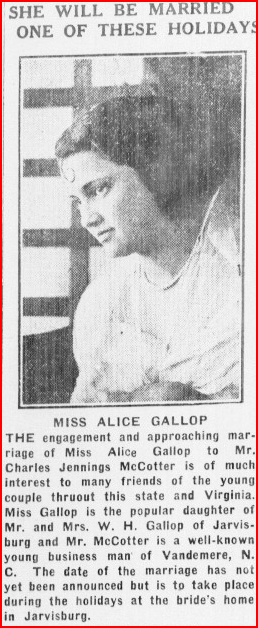 GALLOP-PARKER - A wedding of interest in Currituck was that of Miss Edith GALLOP of Harbinger, N.C. to Mr. Charlie H. PARKER of Mamie, N.C. They were married in the Baptist Pastorium by Rev. J.L. WALDREP of Mamie on November 18th.