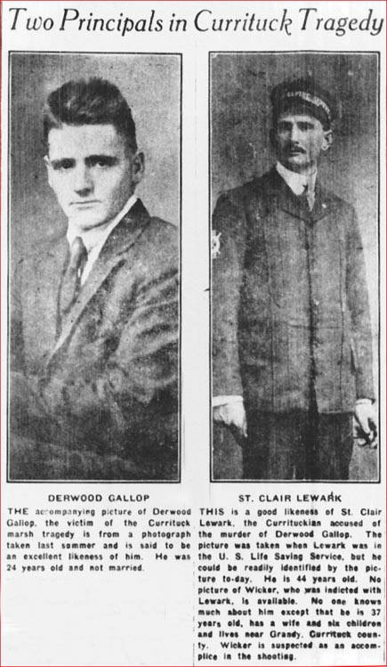 Guards Held for the Murder of Durwood Gallop Near Poplar Branch on Nov. 25 Will Be Tried Next WeekA hard fought legal battle will be aged at Currituck C.H. next week when St. Clair LEWARK and John WICKER, late guards of the Pine Island Shooting Club of that county, go on trial for the murder of Derwood GALLOP, a young Currituckian who was shot to death while in the vicinity of the Pine Island Club grounds on the evening of Thursday, Nov. 25, 1920.