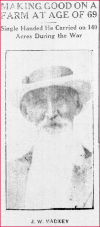 J.W. MACKEY of Moyock, Currituck County, is a gray-headed example of just how independent a North Carolina farmer may be of the labor problem and Mr. MACKEY is 69 years old. When his only son was taken in the draft in 1917 and when war industries had drained his section of common labor, Mr. MACKEY was left with a farm of 140 cleared acres and only himself to work it. But with a four-horse gang plow and other labor saving machinery he set to work to make a crop by himself. He got 30 acres of corn, 60 acres of soy beans, 8 acres of wheat and 7 1/2 acres of rye. He made good on every acre. Only once did he find himself in a cramp: that was when he came to harvest his wheat. He had to have help then and he got a woman. He and the one woman saved the wheat. He repeated the experience again this year and single-handed has carried on his farming successfully, having paid out only $4.25 for labor to date. Recently his son has been discharged from the Army and Mr. MACKEY will have help in harvesting his crops this fall. He is none the worse off for his experience and, in spite of his 69 years, is pink and frisky. The accompanying photo is from a snapshot by W.O. SAUNDERS.