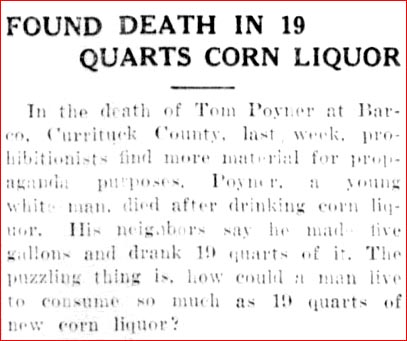 POYNERS NOT GUILTY - Benjamin and Thomas POYNER charged with the felonious shooting of Sam CRANE at their home near Coinjock on the night of Sunday, March 13, were found not guilty when their case came to trial in the Recorder's Court of Currituck this week. The evidence was that CRANE, probably under the influence of liquor, tried to force an entrance to the home of Ben POYNER and Tom POYNER emptied a load of bird shot into him. CRANE was ill for several weeks from the effects of the shot.Friday - April 22, 1921; pg. 10