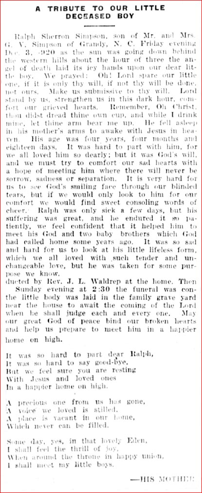 Mrs. Laura BALLANCE, wife of Frank BALLANCE and daughter of G.A. and Laura GRIGGS, born May 28, 1878, died at her home at Maple, Currituck County, January 18, 1919 as a result of influenza which developed into pneumonia. She was 41 years old. We all realize that God moves in a mysterious way. His wonders to perform and though we cannot understand it, yet some day we shall know. Truly it was a loss to her many friends, and a greater loss to her loved ones, but we know our loss was her eternal gain. It seems to us that the angels must have been made happier when they enrolled sister BALLANCE in the realms above. Her last moments were spent in prayer which revealed to us much more of her Christian character. we extend our heartfelt sympathy to the bereaved husband and children.Friday - February 21, 1919; pg. 1