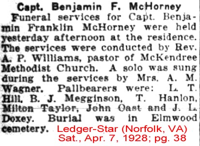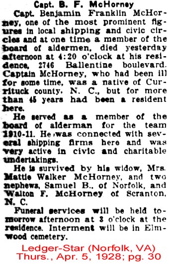 HARBINGER - Joseph McCAIN, 78, of Caratoke Highway, passed away Thursday, June 30, 2005. Born in Kellyton, N.C., Mr. McCAIN was the son of the late P.T. and Ethel Thomas McCAIN, and was predeceased by his first wife, Ruth McCAIN; and two sisters, Dorothy BARTON and Jimmy Ruth TUCKER. Joe was a Korean War veteran and retired from the U.S. Navy after 22 years of service as a chief yeoman. He was a retired real estate broker in Virginia and North Carolina, the retired owner of Kill Devil Manor Motel, Kill Devil Hills, N.C., and the retired owner of Killdee Motel, Nags Head, N.C. He was a member of Powells Point Baptist Church. Survivors include his loving wife of 28 years, Audrey Elizabeth McCAIN and great-grandchild, Peyton L. FOSTER of the home; two sons, Joseph "Joey" P. McCAIN, JR. and wife Linda of Norfolk, Jerry F. McCAIN of Chesapeake; step-son, Greg S. MUSTIN of Poplar Branch, N.C.; daughters, Judy APPEL and husband Jens of Quinton, Va., Jeanie CLONINGER and husband Dave of Lawrenceville, Ga., Jackie JACKSON and husband Jim of Portsmouth; step-daughters, Judy WALKER and husband Otis of Jarvisburg, N.C., Janet JENKINS and husband Chip of Coinjock, N.C., Sharon JOHNSON and husband Sherwood of Currituck, N.C., Jackie SZYMANSKI and husband Steve of Camden, N.C., Sandra LEE and husband Tom of Kitty Hawk, N.C., Karen NEWBERN and husband David of Brush, Colo.; 34 grandchildren, 13 great-grandchildren and more on the way. Joe was a very special granddad and paw-paw and will be greatly missed. Joe is also survived by two brothers, J.T. McCAIN and wife Evelyn of Soperton, Ga., and Jerald McCAIN and wife Mary Ann of Montgomery, Ala.; two sisters, Inez BUGBEE and husband Toby of Goodwater, Ala., and Rebecca SHIVERS of Alex City, Ala. A funeral will be conducted at 1:30 p.m. Sunday at Powells Point Baptist Church. The Rev. Herbert HEMMINGWAY will officiate. Interment will follow in the church cemetery. The family will receive friends from 6 to 9 p.m. Saturday at the Great Bridge Chapel of Oman Funeral Home & Crematory, 653 Cedar Road, Chesapeake. (The Virginian-Pilot - Friday, July 1, 2005)