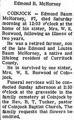 GRANDY – Bernard Carl MERKEL, 77, of Walnut Island, Grandy, died Friday, Nov. 14 in the Albemarle Hospital in Elizabeth City. He was a native of Richmond, Va. and a retired printing engraver. He was the son of the late William F. MERKEL, SR. and Blanche Emma MERKEL. Survivors include four nieces: Nita M. JONES of Richmond, Linda G. MANNING of Dallas, Texas, Elizabeth M. OWENS of Roanoke, Va. and Brenda M. SMITH of Raleigh; two nephews: William L. MANNING of Richmond and Toby W. MERKEL of Kitty Hawk. A graveside funeral service was held Nov. 17 in Riverview Cemetery in Richmond, Va. Twiford's Memorial Chapel in Elizabeth City was in charge of arrangements. (The Coastland Times Tuesday, November 18, 1997; pg. 10A)