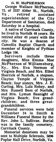 Alverta MERCER died Feb. 6, 1991, in a hospital. Mrs. MERCER, a native of Currituck County, was a member of New Providence Baptist Church, Shawboro, N.C. Survivors include her husband, Bruce MERCER, SR.; three daughters, Esther GREEN of Richmond, Alverta CUFFEE of Virginia Beach and Ida Mae MERCER of Chesapeake; seven sons, Wilbert L. BARNARD, Lewis MERCER, Bruce MERCER, JR., Clyde MERCER, Robert MERCER, Arthur MERCER and Albert MERCER. (The Virginian-Pilot – February 9, 1991; pg. B2)