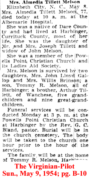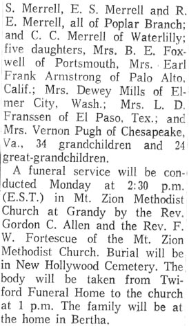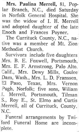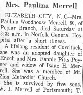 Elsie Saunders MERRELL, 96, of 856 Aydlett Road, Aydlett, died Wednesday, May 28, 2008 at the Outer Banks Hospital. She was born in Poplar Branch, the daughter of the late Ellie Wilson and Bessie Owens SAUNDERS and was the widow of Tillman MERRELL. Mrs. MERRELL was a retired Post Master of the Aydlett Post Office, a member of Sharon United Methodist Church, Order of the Eastern Star, Coinjock Chapter #218 OES, and was a former member of the Poplar Branch Arts and Crafts. A devoted wife of 76 years to Mr. Tillman MERRELL who died March 30, 2008 is survived by a daughter, Jeanette M. VITASEK of Chesapeake, Va.; two sons, T. Wayne MERRELL of Aydlett, and Dan L. MERRELL of Kill Devil Hills; two sisters, Norma BARCO of Grandy and Hazel HAWKINS of Chesapeake, Va., six grandchildren and seven great-grandchildren. A funeral service will be held Sunday, June 1, 2008 at 2 p.m. in Mount Zion United Methodist Church with Rev. David BLACKMAN and Rev. Renee EDWARDS officiating. Burial will follow in the Saunders Family Cemetery. The family will receive relatives and friends at the residence. Twiford Funeral Homes, 405 East Church Street, Elizabeth City, is in charge of funeral arrangements. (The Daily Advance - Friday, May 30, 2008)