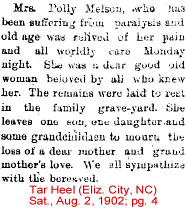 VIRGINIA BEACH, VA. – Eva Melson MERCER, 82, died February 2 in Camelot Hall Nursing Home in Virginia Beach. She was born in Waterlily, the daughter of the late Milton and Penelopy Hayman MELSON and the widow of Richard W. MERCER. She had retired from the Currituck County Public School System after 21 years. She was a dietician and was a member of Mount Zion United Methodist Church in Grandy. She is survived by two daughters: Esther HALL of Virginia Beach and Porcha HOLDEN of Greenville, S.C.; one sister, Elizabeth MARSLENDER of Chesapeake, Va.; 5 grandchildren and 6 great-grandchildren. A graveside service will be conducted at 2 p.m. Thursday in the Mercer Family Cemetery in Grandy with the Rev. Lindy JONES officiating. Twiford Colonial Chapel, Great Bridge, Chesapeake is handling arrangements. (The Coastland Times Thursday, February 4, 1993; pg. 7A)