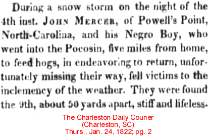Martha Luvenia MERCER, 83, died Jan. 7, 1996. The funeral will be at noon Saturday in Pilgrim Journey A.M.E. Zion Church, Moyock, N.C. Metropolitan Funeral Service is in charge. (The Virginian-Pilot – January 11, 1996; pg. B4)