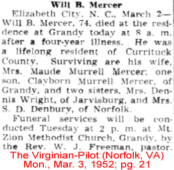 Elizabeth City, NC 27909 is serving the MERCER family. ITwiford Funeral Home)Will B. MERCER