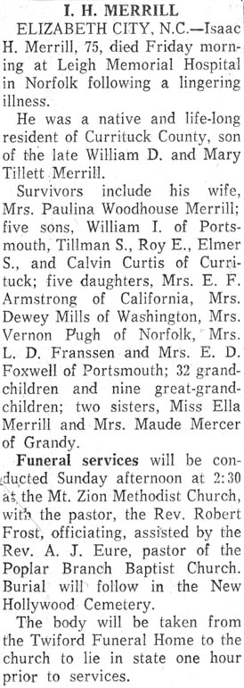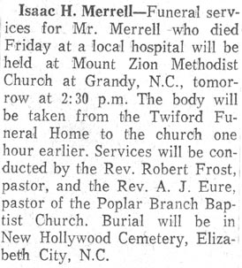 | Submitted by Judy Merrell Brickhouse. Isaac Holly Merrell was born Nov. 4, 1882 and died Apr. 18, 1958 The newspapers that these articles came from is unknown. See the Merrell family photo album. |