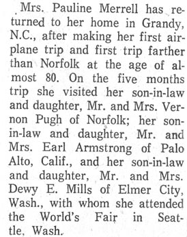 | Submitted by Judy Merrell Brickhouse. Paulina was born Sept. 16, 1882 and died Aug. 10, 1963. The newspapers that these articles came from is unknown. See the Merrell family photo album. | |