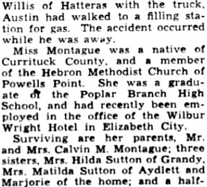 POWELLS POINT – Donald Paul MONTAGUE, 76, retired Powells Point farmer, died Monday in his home after a heart attack. He was born in Dare County and lived in Powells Point most of his life. He was a son of Ike and Mrs. Pargan Shannon MONTAGUE and the husband of Mrs. Amelia Woodhouse MONTAGUE. He was a World War I veteran and a member of Jehovah's Witnesses in Elizabeth City. Besides his widow, surviving are two sisters: Mrs. J.W. FORBES and Mrs. Dail HUBBARD of Powells Point. A funeral service will be conducted today at 10 a.m. in Twiford Funeral Home in Elizabeth City by the Rev. T.M. STINGLEY of Jehovah's Witnesses Church. Burial will be in the family cemetery at Powells Point. (The Coastland Times September 4, 1963)