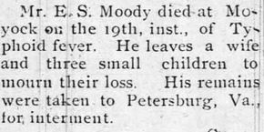 Johnnie Edward MOORE, 88, a retired farmer, died Dec. 21, 1991, in a hospital. Mr. MOORE was born in Currituck County. He was a member of Berea Baptist Church and was the widower of Etta Rebecca Winslow MOORE. Survivors include two daughters, Della J. MONTGOMERY of Henderson and Effie Mae M. SHINAULT of Kentucky; a son, Dewey SIMPSON of Virginia Beach; 10 grandchildren; and nine great-grandchildren. The funeral will be held at 11 a.m. Monday in Twiford's Northside Chapel. (The Virginian-Pilot – December 22, 1991; pg. B2)