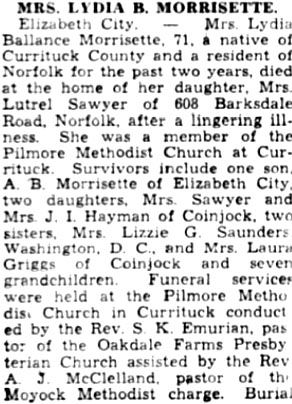 Elizabeth Gibbs MURDEN, 89, of Barco, NC died Wednesday, July 9, 2003, in the Albemarle Hospital. She was born in Currituck County to the late Thomas B. and Annie Sermon GIBBS and was the widow of the late William J. MURDEN. Mrs. MURDEN was a member of the Rehoboth Baptist Church, WMU and was devoted to her church and its members. Mrs. MURDEN is survived by several nieces, nephews and numerous friends. Funeral services will be conducted Friday, July 11, 2003, at 2:00 p.m. in the Twiford’s Memorial Chapel. Burial will be in the New Hollywood Cemetery. Twiford Funeral Home, 405 E. Church St., Elizabeth City is in charge of arrangements. (The Virginian-Pilot - July 10, 2003; pg. B7)
