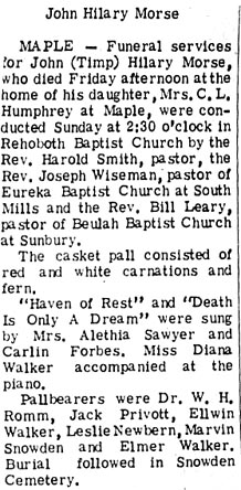 William Henry “Biggan” MURROW, 50, of Shawboro, NC, died Thursday, June 12, 2003 at Albemarle Hospital. He was born in Gainesville, FL to the late William and Martha Shimp STANLEY and was a well known self employed plumber in the Albemarle area. Mr. MURROW is survived by his live-in companion for over four years, Carol A. Hogan PLICHTA; four sisters, Mary Ellen BURNHAM of Orlando, FL, Luella Rose SNOW of Jacksonville, FL, Floydeane Marie GOODWIN of Tampa, FL and Barbara Rose RILEY of Orlando, FL; and one brother, Wayne Thomas RUSHWORTH of Rome, GA. The family will receive friends and relatives at Twiford’s Memorial Chapel, Church St. on Monday, June 16, 2003 from 7:00 to 8:30 PM. At other times the family will be at the residence. (Twiford Funeral Home records)