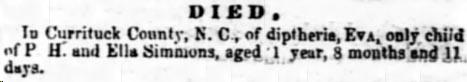 CURRITUCK CO., N.C. - On Tuesday, the 7th inst. at Currituck Court House, about 5 o'clock, p.m., Martha, the daughter of B.T. SIMMONS, departed this life after an illness of five days. She had just returned from school with her mind richly stored with useful knowledge, and adorned with all the charms of "sweet sixteen". In her were cherished the hope and delight of a devoted & affectionate father and relatives. (The Old North State - Saturday, August 18, 1849)