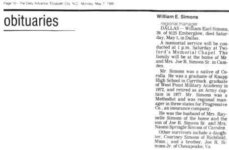 David Douglass "Boots'' SIMMONS, 46, died Sept. 14, 1991, in a hospital. Mr. SIMMONS was born in Coinjock, N.C., where he was a member of Center Chapel A.M.E. Zion Church. Survivors include a daughter, Jean MURDOUGH, and his mother, Audrey SIMMONS, both of New York City. The funeral will be conducted at 2 p.m. Saturday in Center Chapel A.M.E. Zion Church by the Rev. Roger GREENE. Burial will be in the Simmons family cemetery, Coinjock. (The Virginian-Pilot – September 19, 1991; pg. D6)