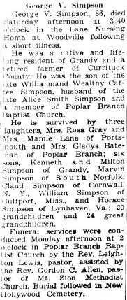 Georgia A. SIMMONS, 88, died Feb. 26, 1995. A funeral will be at 2 p.m. Sunday in Center Chapel AME Zion Church. Stallings Funeral Home in Elizabeth City is in charge. (The Virginian-Pilot – March 3,1995; pg. B5)