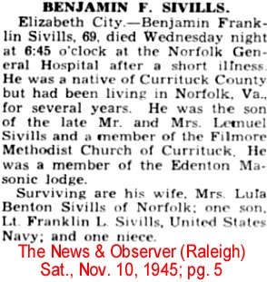 Eva Ritter SIEBERT, 94, died June 14, 1991, in a Chesapeake hospital. Mrs. SIEBERT was a native of Knotts Island, N.C. She was the widow of Asbury T. RITTER. Survivors include a son, Gilbert RITTER of Norfolk; 16 grandchildren; 26 great-grandchildren; and six great-great-grandchildren. The graveside service will be at noon today in Forest Lawn Cemetery. Smith & Williams Funeral Home, Norfolk Chapel, is handling arrangements. (The Virginian-Pilot – June 15, 1991; pg. D2)